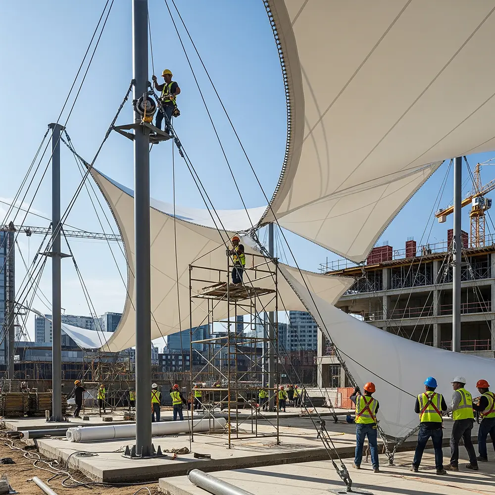 Material membrane yang digunakan umumnya terdiri dari PVC, PTFE, atau ETFE yang memiliki daya tahan tinggi terhadap cuaca ekstrem. Untuk memahami kualitas bahan, Anda bisa membaca bahan membrane tensile berkualitas.